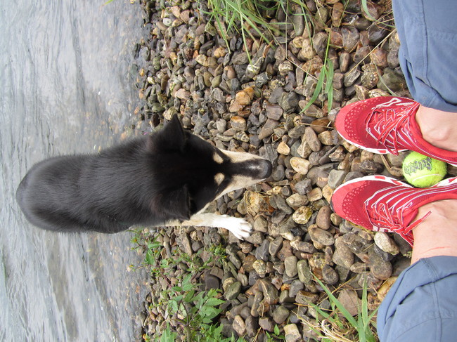 Gisteren zijn we samen bij de Maas geweest om met de bal te spelen. We hebben een hoop lol gehad. Ik gooide, maar ik gooi niet altijd de kant op die hij - of ikzelf trouwens - verwacht. Dus een paar keer was hij de bal kwijt in het hoge gras. Het was apporteren in combinatie met zoekspelletjes en dat werkte wonderwel goed. Ok, hij was twee keer even afgeleid door de eenden, een keer kwam hij uit de Maas zonder bal maar uiteindelijk hoefde ik toch niet te gaan zwemmen om hem weer op te halen. Waar is je bal en hij stoof weer terug het water in om hem te gaan zoeken. Op het einde werden we overvallen door een enorme hoosbui, net toen Shadow de bal echt kwijt was, maar hij heeft stug doorgezocht tot hij hem had. En dat terwijl hij helemaal niet van regen houdt! Zeiknat en tevreden kwamen we thuis. Daar wachttte Spot vol ongeduld voor zijn wandeling. Die bestond ook uit een rondje kermis. Hij was even heel erg onder de indruk maar al snel werd er gesnuffeld, geknuffeld en geluisterd naar touch, zit en koekje