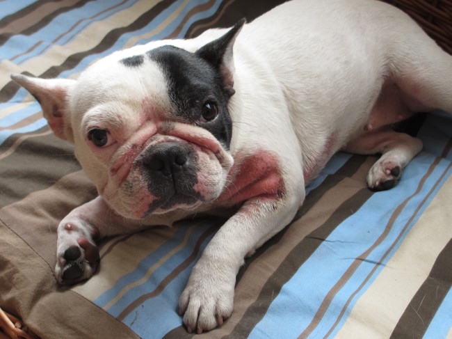 Wij hebben een Frans buldogje op logement (nog 2 weken). Ze heeft een serieus erge allergie en krijgt daarvoor aangepaste voeding. Ze draagt kleertjes om zich niet helemaal open te krabben...