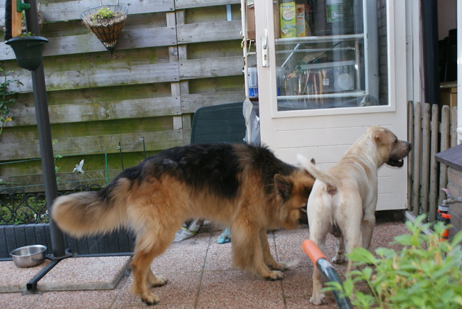 Aangezien Nathalie en haar vriend hier regelmatig over de vloer komen hebben we zoiets van...dat moet Sike ook onze Grizzly leren kennen...maar dat wordt spannend! Ik heb een aantal foto's gemaakt waar jullie het gedrag kunnen zien van de 2 honden..ik zou graag hier meer over willen horen zodat ik meer kan leren over Grizzly zijn gedrag...