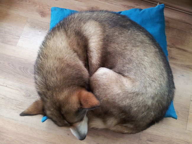 Omdat wij 2 honden hebben, hebben we 2 kussens een grote en een kleine, hier presteren ze het om met zijn 2en op de kleinste te gaan liggen, je ziet niet waar Yoran begint en Rixt eindigd.