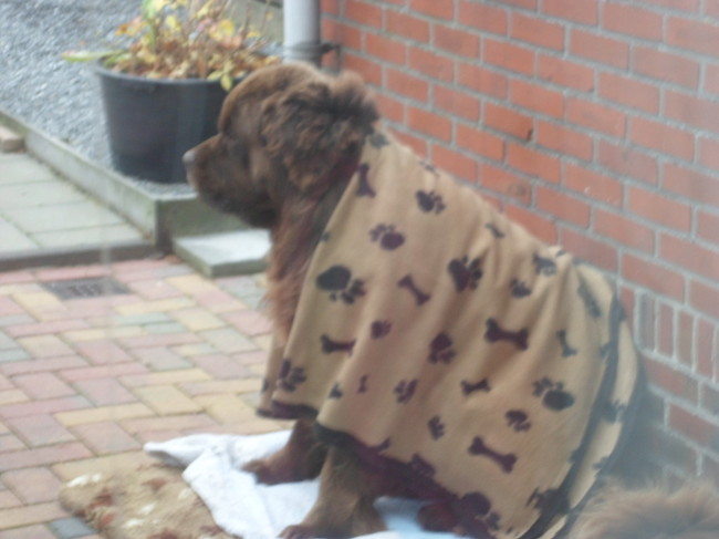 denk niet lang, maar ze wil niet binnen blijven, okee, dan lekker buiten, het is hier guur, geen zon, maar zo,n bloot been is toch niet goed, enne, masseren ? ja zeker, maar niet de hele dag, van verwennerij worden honden puur vervelend.