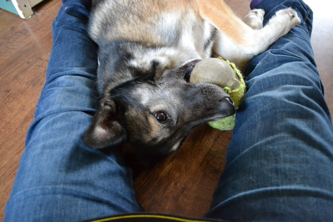 samen op de grond spelen met de bal, ze gaat dan tussen mijn benen liggen te spelen. je ziet dan gewoon dat ze het heerlijk vind dat ik op de grond zit