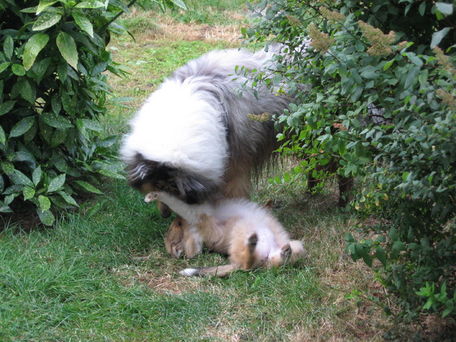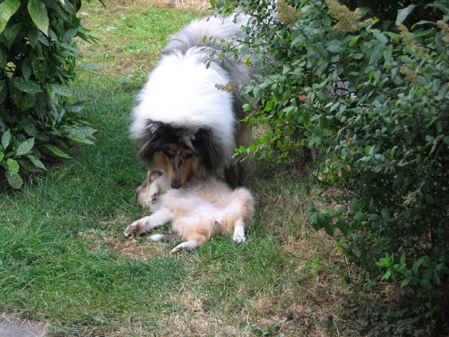 Ja, valt niet tegen op dit moment. Bo duikt door zijn voorpoten heen, kont omhoog speeltje in zijn bek, en hoopt dat Tara er achter aan gaat. Gisteren had hij een bal in zijn bek, en toen Tara niet reageerde liet hij de bal voor haar pootjes vallen.