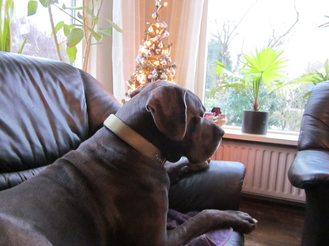 Luan. Het zit geloof ik in de lucht dat de baasjes raar doen. Hier staan 2 van die groene dingen een in de kamer en een in de hal en naast dat ding in de hal staan zo gek ding met een muts op. En als ik langs loop geef ik een duw met mijn neus er tegen en dan maakt dat ding een herrie zeg. zingen noemen ze dat. En dan gaat vrouwtje en baasje lachen. Snap jij dat nu . Het zal wel. Hier hebben ze ook lekkere dingen in gepakt ik heb dat geroken . Maar dat hebben ze in de kast gelegd. Want ze kennen we een beetje ze weten goed dat ik heel goed kan sluipen dus dat hebben ze al door. Nu ik ben benieuwd wat er in zit. Het is er een voor Max mijn vriendje van 10 maanden (van zoon ) en een voor Sonny (van dochter ). Nu dat ga een dolle boel worden.