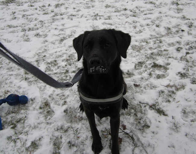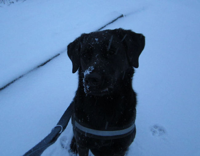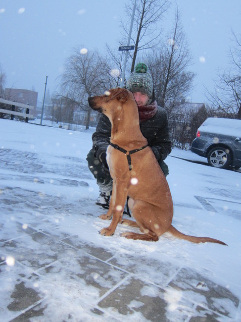 Zie hier een bikkel Juno in de sneeuw, met een baasje die hopeloos probeert te schuilen achter hem