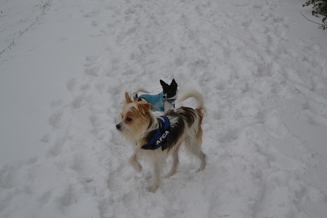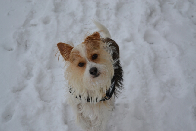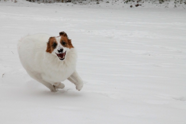 Toen we weggingen thuis was het nog droog, onderweg ging het sneeuwen en het is eigenlijk niet meer opgehouden. Mellow had het helemaal naar haar zin, was ook haast niet op de foto te krijgen (hier waren we bijna bij de auto, dus ze was wel een beetje moe van het rennen).