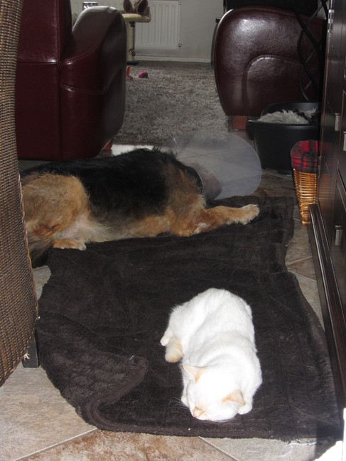 Toen ze beide geholpen waren lag Levi op een deken en Dokus in zijn mandje.