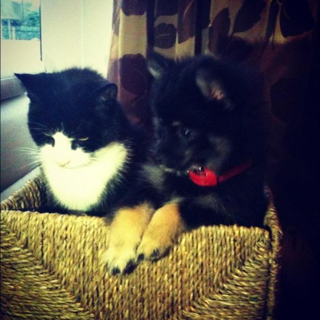 Onze vroegere buren hadden een kat toen de pup kwam. Van jongs af aan dus aan elkaar gewend en spelen en ravotten dat ze deden.