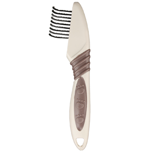 Dit is een klittenkam zoals José zegt. Is heel handig met klitten! Je moet de klauwen achter de klit zetten en zo verder schuiven langs de klauwen. Je snijdt mooi de klit er af zonder het haar te beschadigen