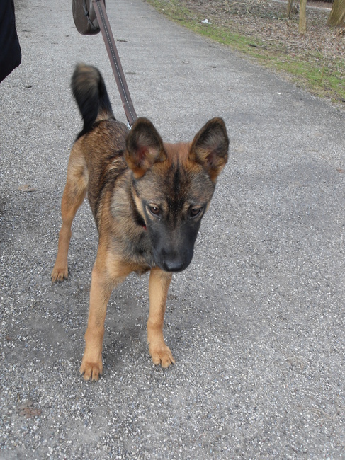 Mijn hond is nu 7 maanden. Ze komt uit een nestje met 5 teefjes en 2 reutjes, waarvan 5 honden een black&tan tekening hebben en kortharige vacht (lijken sterk op duitse pinscher, hoe ze nu eruit zien) en de overige 2 - waaronder dus Kalua - langharig en kleuren die richting Hollandse herder gaan. De moeder van het nest leek ook sprekend op Kalua. Volgens de eigenaar zat hier iets van de wolfskees in, maar zeker wist hij het niet, aangezien hij de hond uit het asiel had gehaald.