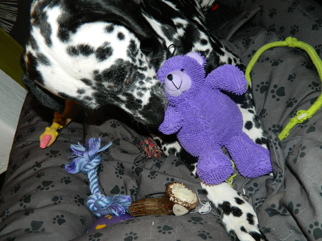 maar wel super schattig; alle speeltjes worden in een bak gelegd, en dan zoekt hij zijn speeltje.