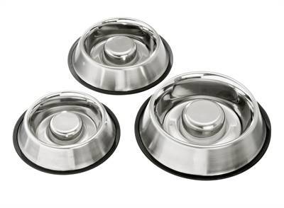 Ik heb in de hond zijn bak een ronde steen liggen, maar je kan elk ander voorwerp met wat gewicht nemen om erin te leggen als het maar wat plaats inneemt en mijn hond kan niet zonder want dan is in 3 happen zijn bak leeg, en gefrustreerd, nee dat is hij er niet van..