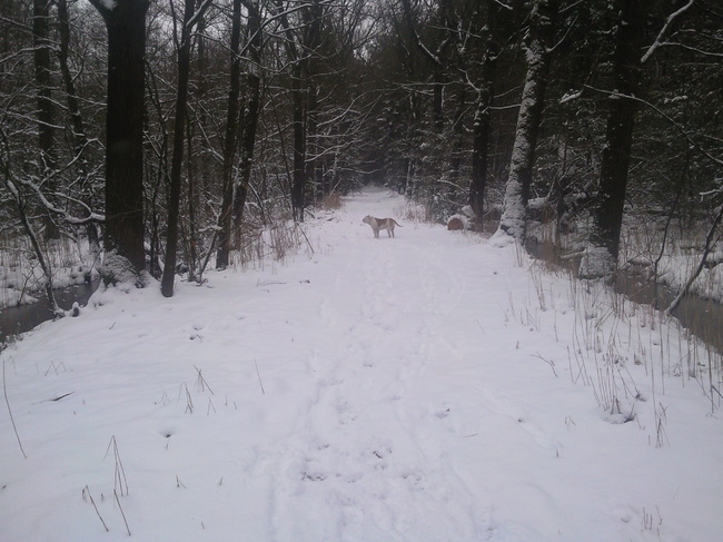 gisteren lag hier 10cm sneeuw, en de weg was 1 grote ijsbaan, dus de hei hebben we niet gehaald. onderweg ben ik bij een bos gestopt, en max vond het best.