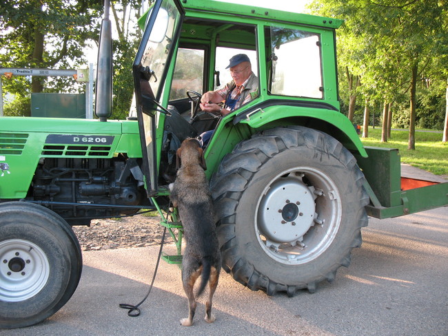 Taat wat ben jij toch een grote en stoere hond leuk he zo tractor Abby is maar klein maar vind ze ook heel erg intressant.