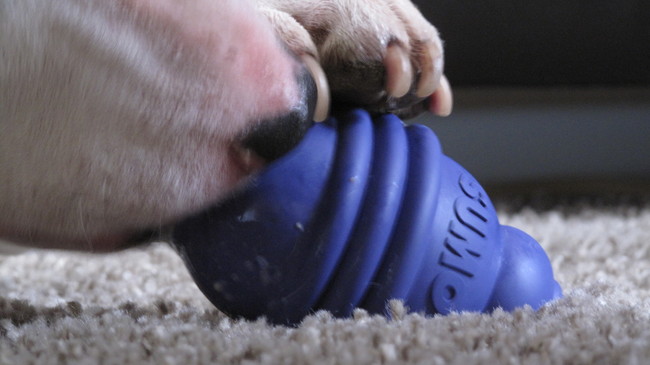 Helaas is het leuke er nu een klein beetje vanaf. Hij heeft namelijk ontdekt, dat als je maar hard genoeg met dat ding smijt, het snoepje er vanzelf uit komt stuiteren!
