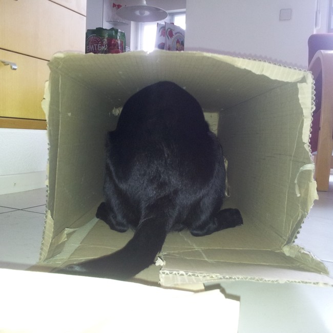 Zo, ik heb jullie tips opgevolgd. Net na het wandelen heb ik hem eerst laten zitten voordat hij naar de kamer mocht. Dat deed hij keurig en huppelde toen vrolijk de kamer in. Mijn vader had net een pakketje binnen gekregen dus hij stapte vol goede moed op het doosje af, maar dat mocht natuurlijk niet. Hij begon weer een beetje van die aanloopjes te nemen om ondeugend te doen. Dus, ik een doos gepakt, gevuld met dat bruine papier wat er bij zat, snoepjes erbij en eens kijken wat hij deed. Nou, hij is een half uur zoet geweest, zie de foto's! Fantastisch!!!! Ik zat erbij en pakte telkens snoepjes in bruin papier in, en meneer was zo slim dat hij precies wist hoe hij de snoepjes eruit moest krijgen. Nou, toen ben ik alles weer gaan opruimen (er is een tijd van beginnen en een tijd van ophouden), en toen begon hij weer ondeugend met sleutels te zeulen. Dus, bij me geroepen, wat oefeningen gedaan waarbij hij de bal terug moest brengen en toen ik merkte dat hij meer ging hijgen heb ik hem heerlijk in de bench gelegd. Daar ligt meneer nu in te slapen, dus heel veel dank voor de goede tips. Ik ga dit zeker zo doorzetten, zodat hij zijn energie kan gebruiken voor andere activiteiten in plaats van rondrennen en overal opspringen