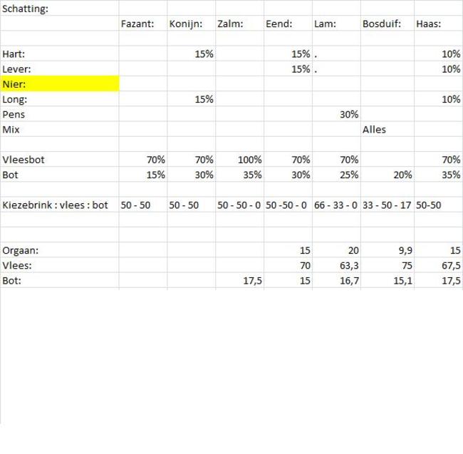 Hazenmix: hazenbout, lever, hart, long. Ongeveer 35% bot. Het is onduidelijk hoeveel orgaanvlees en spiervlees hierin zit. Ik gok gewoon 70% vleesbot en 30% orgaanvlees. Dan geef je 1/2 Kiezebrink en 1/2 spiervlees.