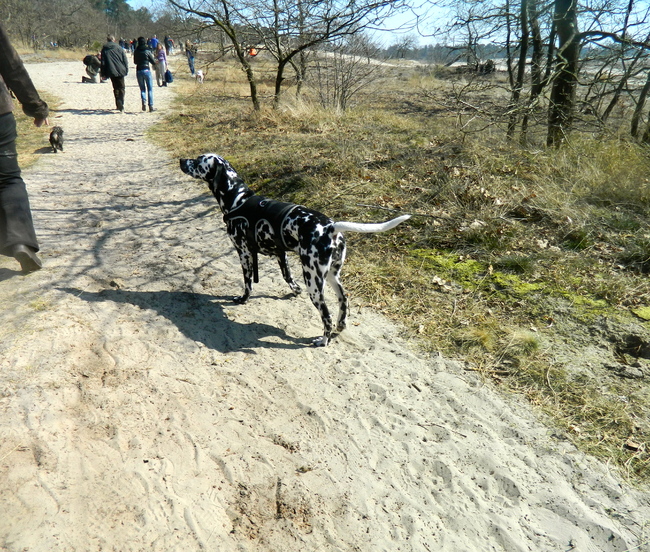 Maar de wandeling was echt GEWELDIG! Ik ben zo blij dat ik gegaan ben. We kwamen pas vrij laat (10 minuten voor de wandeling) aan en er waren al erg veel andere dalmatiërs. Daar heeft het toch nog even geduurd voor we echt vertrokken en heb ik me wat afzijdig gehouden om Perdie rustig te laten wennen. Toen we vertrokken ben ik helemaal achteraan de groep aangesloten om zo rustig af te wachten. Al snel kwamen we op een stuk waar alle honden los mochten. Daar ook nog even afgewacht hoe Perdie reageerde. Ik heb goed op haar lichaamshouding gelet: haar staart ging helemaal recht omhoog en de haren op haar rug en staart stonden dik omhoog. Deze houding heeft ze altijd als er iets spannends gebeurt. Al snel merkte ik dat er geen enkele hond Perdie kwam lastig vallen en dat het veilig was om haar zelf ook los te laten.