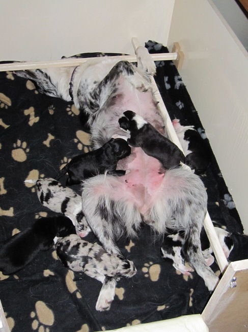 Zal morgen weer wat foto's plaatsen. De pups doen nog niet veel anders dan drinken en slapen, het wordt nu weer echt leuk als de oogjes open zijn en hun omgeving gaan verkennen.