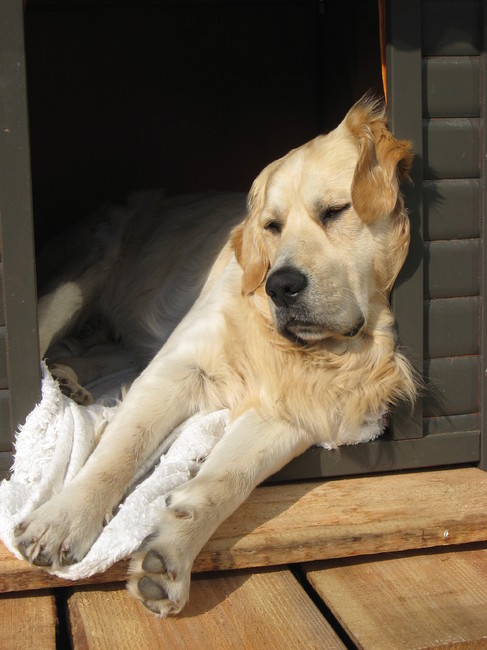 3 doggies Beau zijn chillplek, en dan vooral lekker luieren in het zonnetje.. ik hoop dat het lekker ligt, heb van de week zijn hele hok opgeknapt, en ging er graag in liggen..