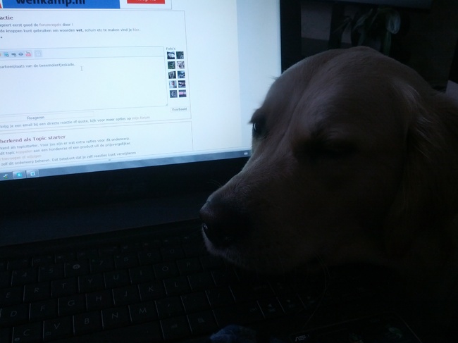 zo schattige foto.wat boomer altijd doet als ik op laptop op hondenpage of internet zit gewoon zijn kopje tussen mijn bazinneke en laptop stoppen en als hij dan geen aandacht krijgt word het een anti toetsen bord hondje legt hij zich er helemaal op tot hij gestreeld word
