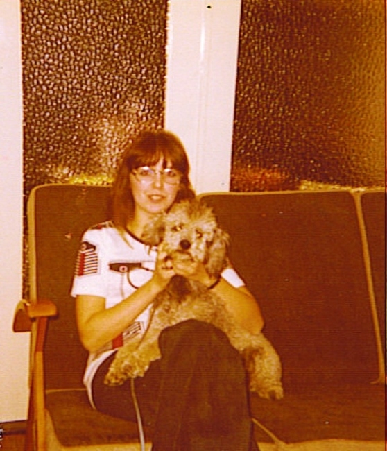 Ik met onze tweede Bouvier Roos als pup. Op de achtergrond staat onze eerste Bouvier Kim, was een reus van een teef met haar 55 kilo. Kim is 12 jaar oud geworden. Roos maar 3 jaar. Ze had epilepsie en kwam op een dag niet meer uit een aanval.