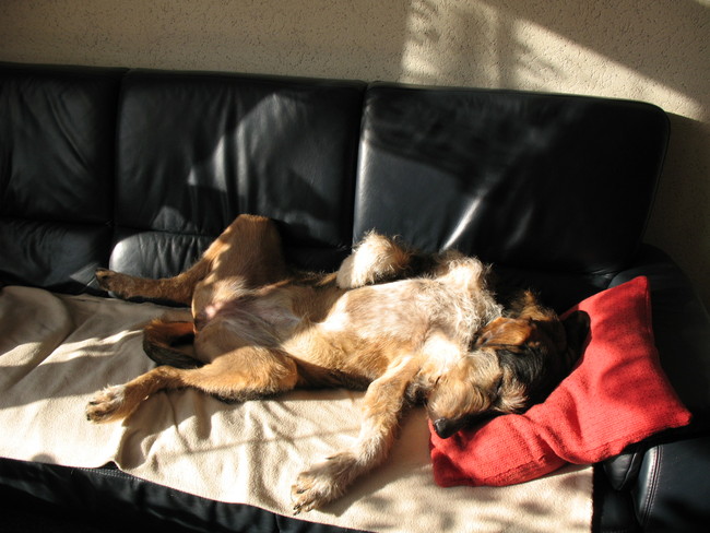 , tijdens een wandeling gaat ze gewoon ergens liggen, soms is ze zelfs te lui om haar achterwerk te laten zakken. Ze vleid haar koppie op de grond en val zowaar is slaap