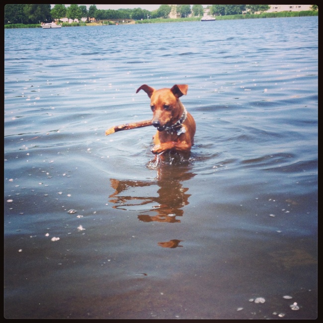 Pumba heeft het echt warm de afgelopen dagen. Gisteren wilde hij niet eens meer lopen en trok hij mij mee naar de schaduw en ging daar uithijgen. Moest toch een stuk door de zon lopen, dus hup opgepakt en hem richting het strand meegenomen. Hij heeft een hekel aan optillen, maar nu bleef hij rustig in mijn armen liggen. Oo en zo trots dat ik ben moet ik echt iedereen vertellen dat Pumba een paar dagen lang elke dag heeft gezwommen!! Gisteren leek hij het echter wel koud te hebben na het zwemmen. Hij bibberde en wilde er niet meer in.. Hier een paar leuke foto's van de afgelopen dagen.