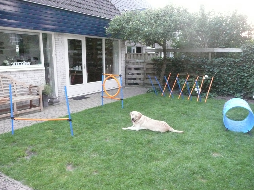 Geweldig, wanneer ik dan eindelijk het parcours heb op gezet heeft hij de tunnel of de horde al tig keer genomen. Ook zijn die scheve paaltjes goed voor het voeten werk!