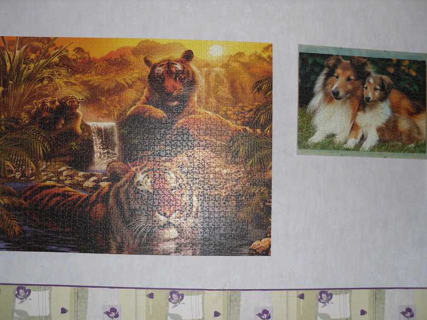 Die met de 2 tijgers is de grootste, 2000 stukjes. (die met de hondjes is trouwens ook een puzzel)