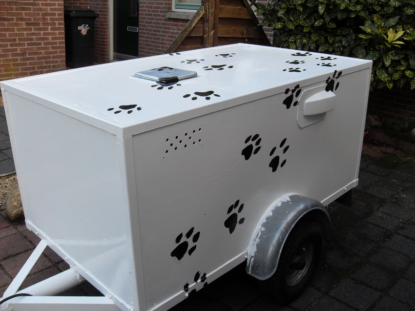 Heb hem eerst wit geverfd en dan de pootjes erop. In begin was hij vuilwit met grijze deurramen. Wij hebben deze aanhanger juist gekocht omdat het veiliger is. de honden kunnen niet de hele aanhanger door stuiteren of iets zien waardoor ze een stuk minder stress hebben. er zijn 3 boxen voor bouvier formaat.