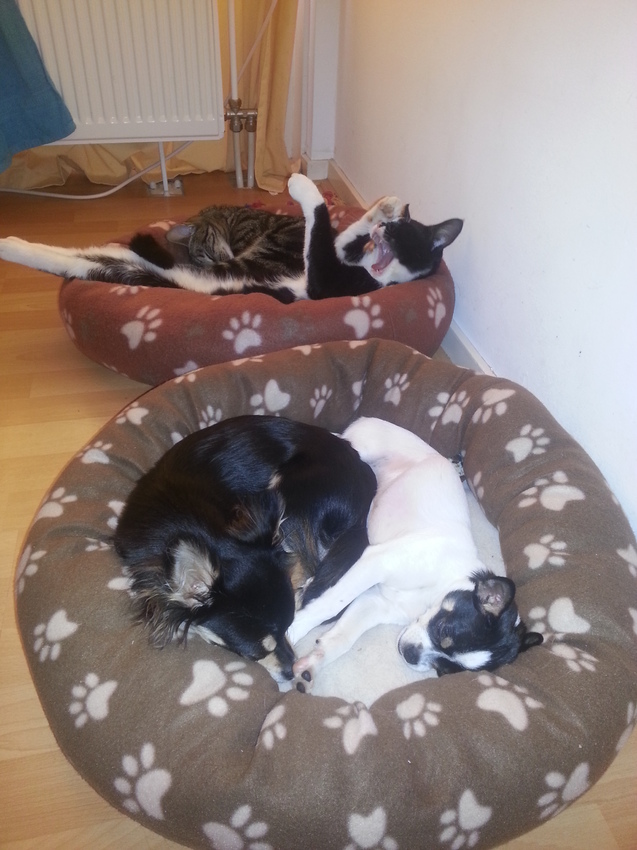 lol voorlopig hebben de katten hier in tegenstelling tot bij Beauty... wel respect voor Sadi haar plek en als ze er die ene keer toch liggen en Sadi komt eraan vliegen ze weg terwijl bij Beauty het zo was dat ze stug bleven liggen en Beauty maar ergens anders ging liggen of ons zielig stond aan te kijken, wij op onze buurt Beauty aan moedige om haar plek op te eissen. En als ze naar onze aanmoedigen dan uiteindelijk toch op haar plek neer plofte dan gingen de katjes dus wel aan de kant. Garfield bleef een enkele keer liggen met gevolg Beauty haar achterste op zijn lichaam, maar ja das dn zijn eigen schuld.