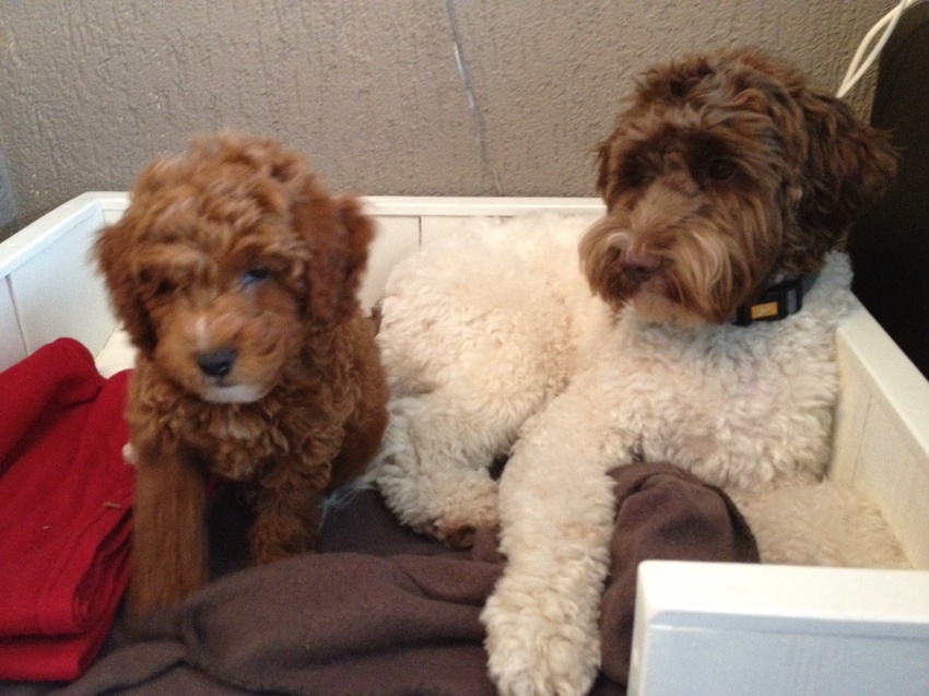 Hier hebben ze nooit samen gespeeld of geslapen. Nina zou dat wel gewild hebben, maar Lara wou en wil daar niets van weten. Maar goed Lara was ook ruim 10 jaar toen er een pup kwam... (Die blik van "moet dat ding hier nu echt zijn/blijven? Bedankt hoor" herken ik heel goed). Ze delen hier het speelgoed en dat gaat goed. Lara geeft "toestemming" aan Nina wanneer Nina haar bak mag uitlikken. Wanneer er eentje een botje laat liggen word er geruild en verder geknabbeld dat gaat allemaal goed.