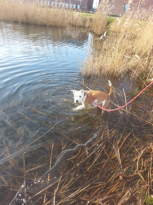 net zijn we met hummer lekker even na een park geweest. Voor het eerst met zijn poten in het water geweest, hij vond het super leuk. Wilde eigenlijk het water niet meer uit, kleine waterrat haha. We zijn daarna door park gelopen, en mocht hij eigenlijk nog even in het water. We kwamen een man tegen met 2 franse bulletjes, hummer wou spelen maar dat mag ie van ons niet aan de riem. We hebben hem even los gemaakt, en heeft nog een half uur zo iets gespeeld met 1 van de 2 bulletjes. Hij ligt nou al heerlijk een uur te slapen, hij is zo moe hihi. En we hadden em beter niet kennen douche gisteren, hij ziet weer zwart haha. Achjaaa daar is het een hond voor