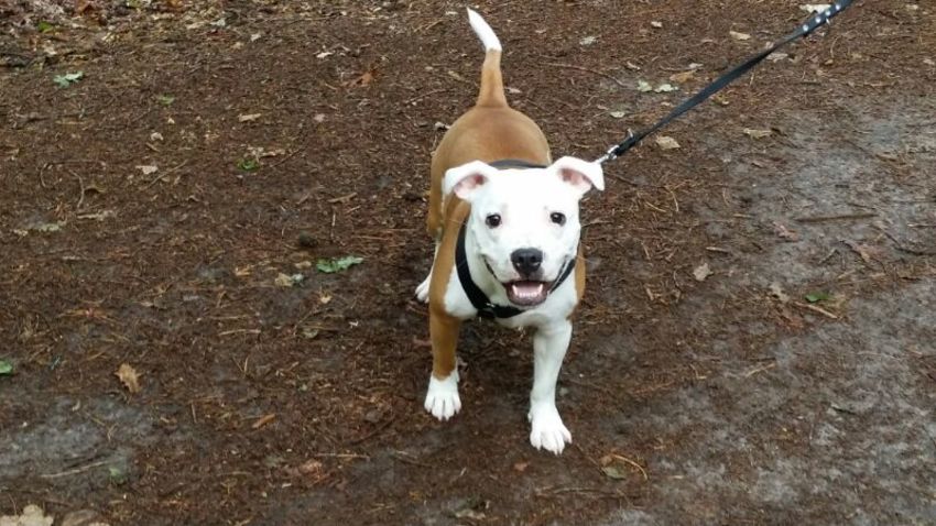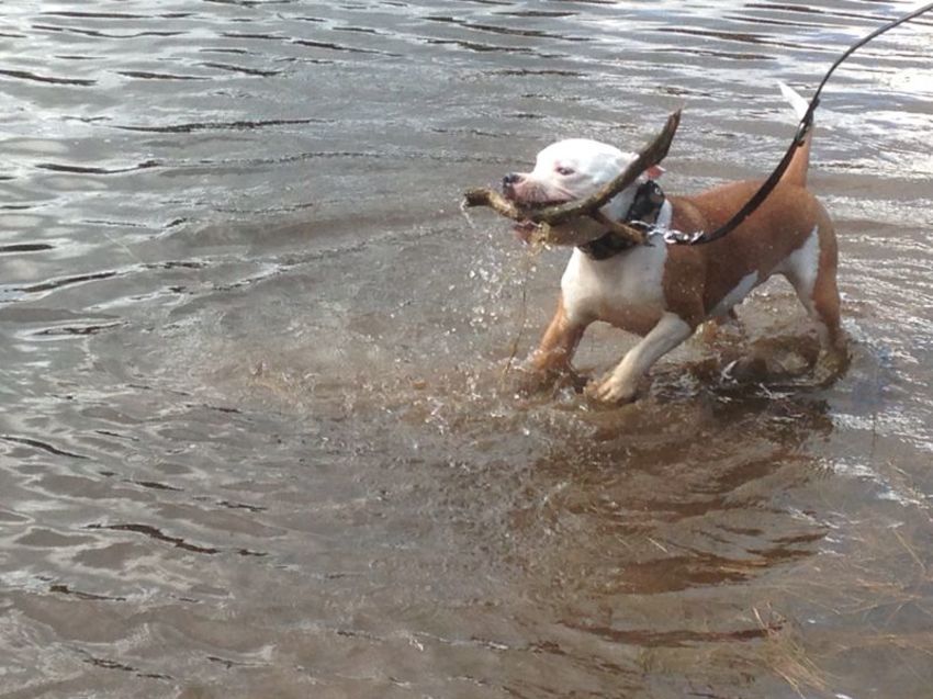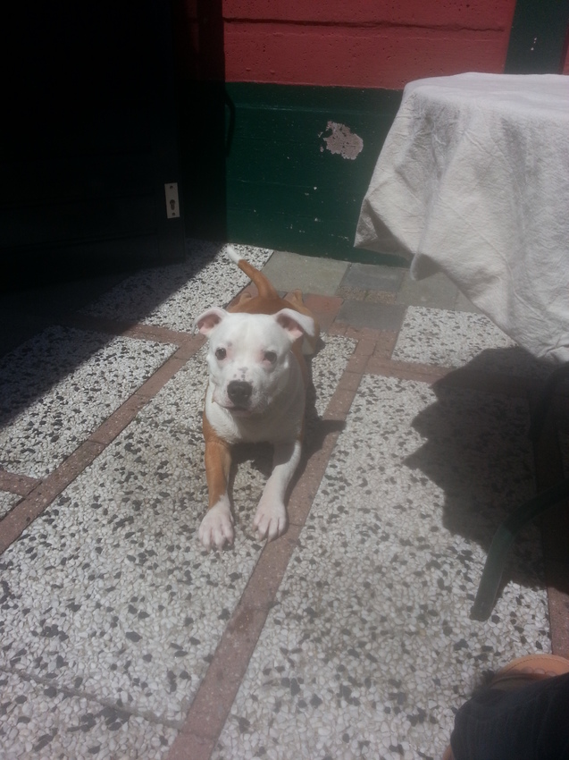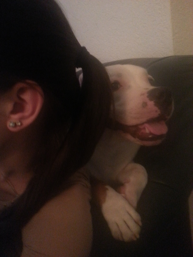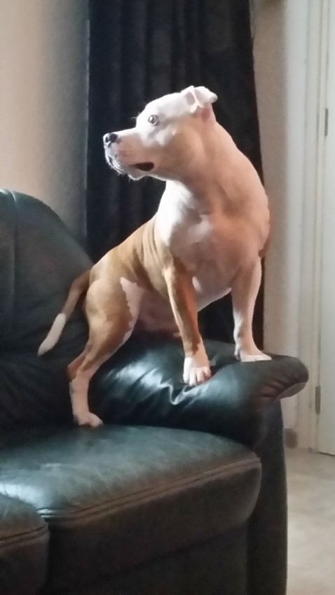 Tijdelijk hebben we er een amerikaansse stafford reu van bijna 10 jaar erbij. De hond van me ouders. Door prive omstandigheden, is hij een aantal maanden hier. Het is alleen onwijs jammer dat ze elkaar binnen niet accepteren en elkaar ook al is er niks in de haren willen vliegen. Binnen zitten ze dus apart. Tijdens de wandelingen (aan de riem) gaat het goed, en steeds beter