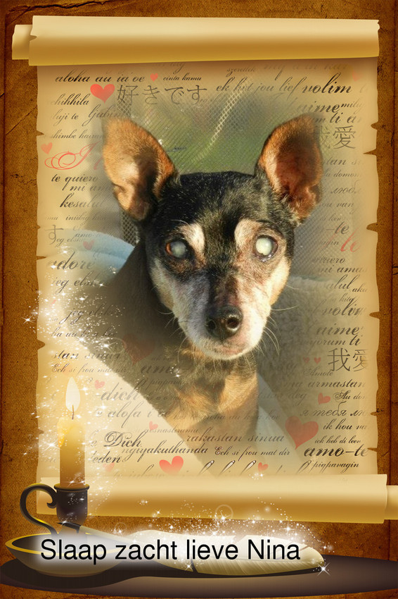 Lieve Nina, of je nu lekker aan 't rusten bent of vrolijk aan 't spelen... nieuwe dingen ontdekt of je vriendjes en familie ontmoet... We wensen je toe dat je geniet. Na een mooi leven hier en de kwaaltjes de laatste tijd heb je dat zeker verdiend !
