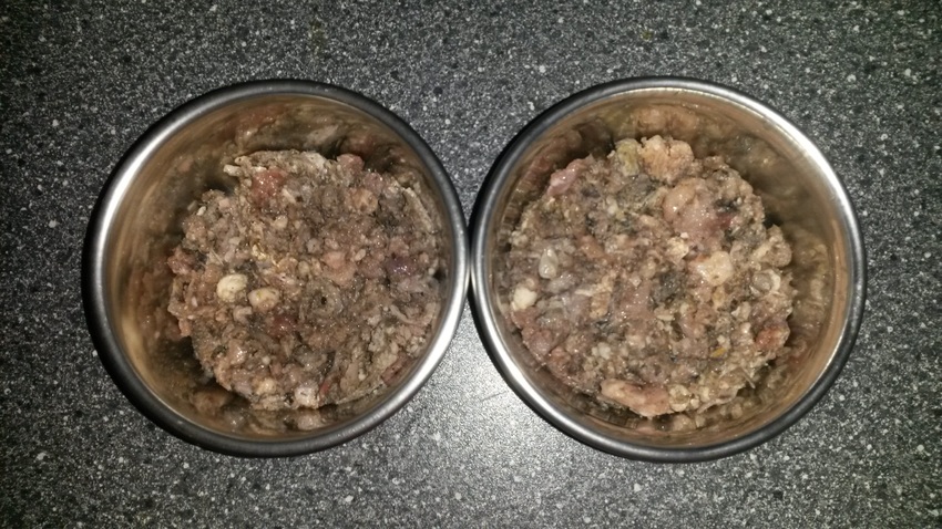 Cosmic heeft vandaag kippenvleugels met gemalen hertenvlees, restje van gisteren, en Wispa heeft vandaag konijnkarkasjes met kalkoenfilet.