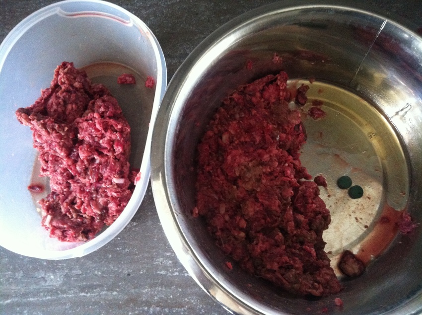 Morgen krijgt Drib pens met gefermiteerde groente en koudgeslagen honing. De kat krijgt nogsteeds eendennekken met orgaanmix en bio Cranberry poeder.