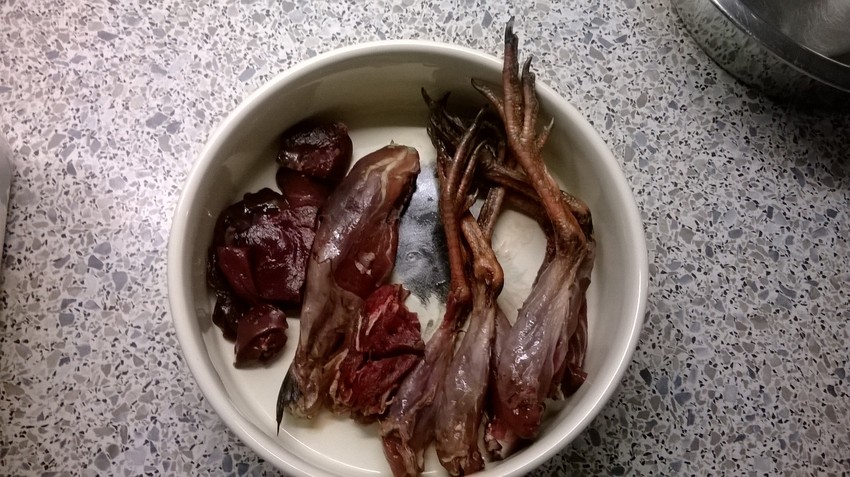 Gisteren was het Geitenpoot (2 weken oud), gemalen konijn, biologische Runderlever, sperziebonen, wortel en een eitje: