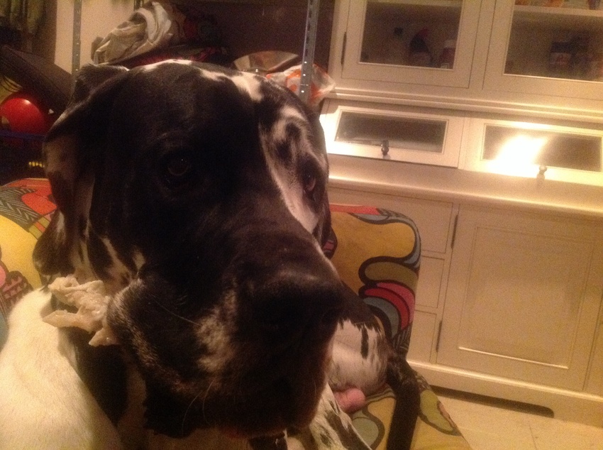*middagritueel: het samen zijn van frauwtje en dog op de bank in de kelder. Frauwtje met een cappuccino en dog met een knabbelschoentje gevuld met pindakaas.