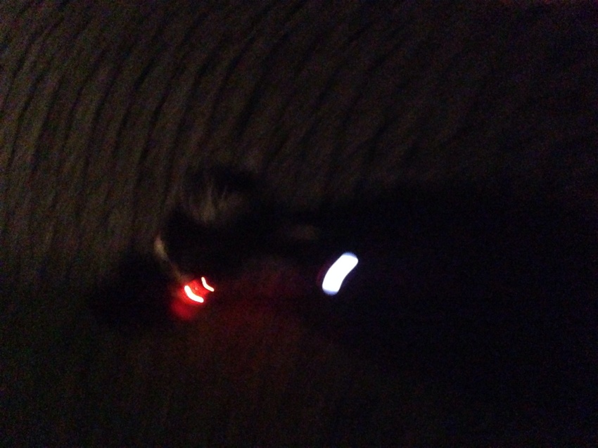 Twinko is lastig te zien in het donker en omdat hij zo klein is zitten de meeste hondenlampjes niet prettig of slaan ze uit tijdens het rennen. Lichtgevende halsbandjes zijn ook nooit in zijn maat of hebben een giga batterijblok, en sowieso verzet hij geen stap met een halsband om.