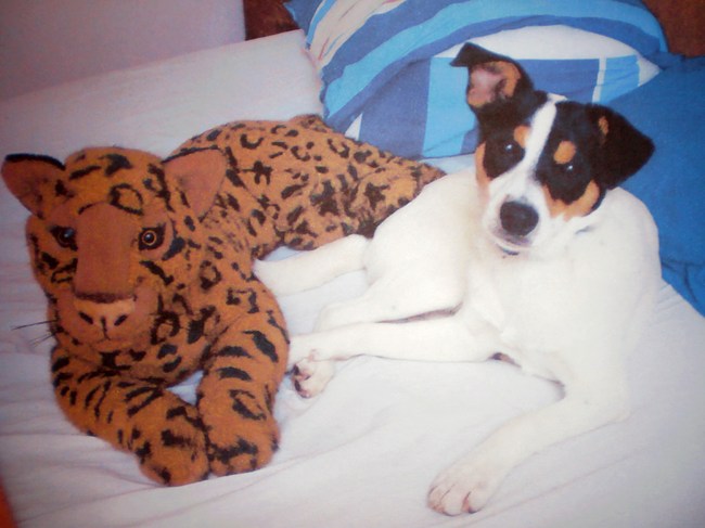 haha zo had onze vorige hond een konijne knuffel die over al mee heen moest! zelfs mee op wandel! haha