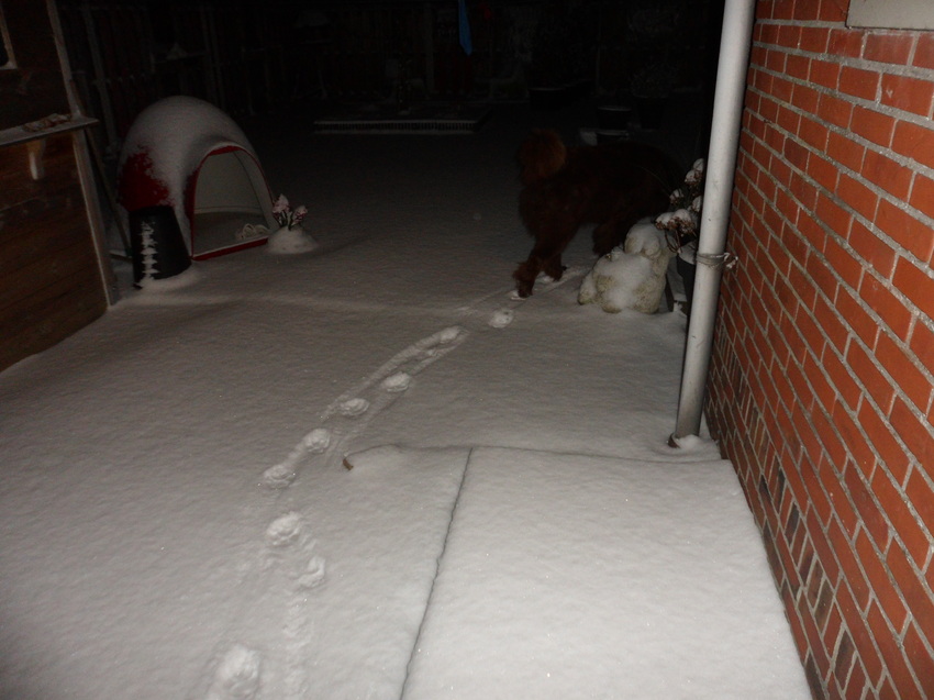 Zo Ozzie en ik hebben zojuist onze eerste wandeling in de sneeuw achter de rug. Echt grappig!!!