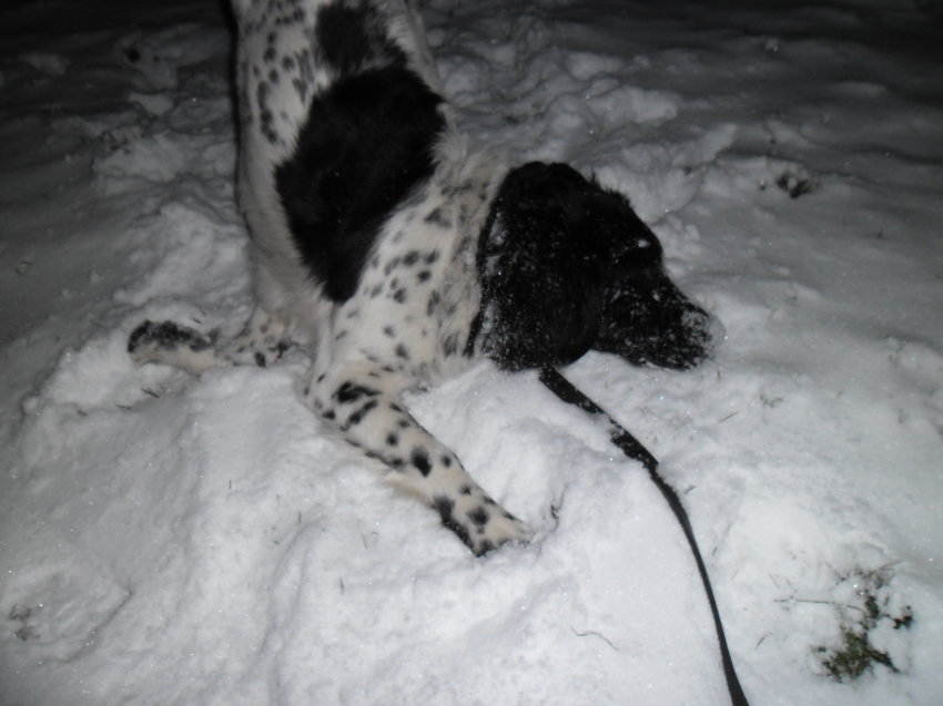 Ozzie lag in dat kleine beetje sneeuw te rollen alsof zijn leven ervanaf hing, rende achter de sneeuwvlokjes aan. Super leuk. Morgen zal er wel veel meer liggen, leuk dit!!!