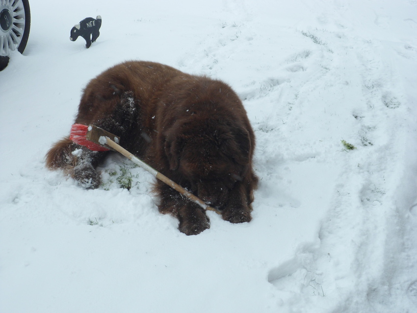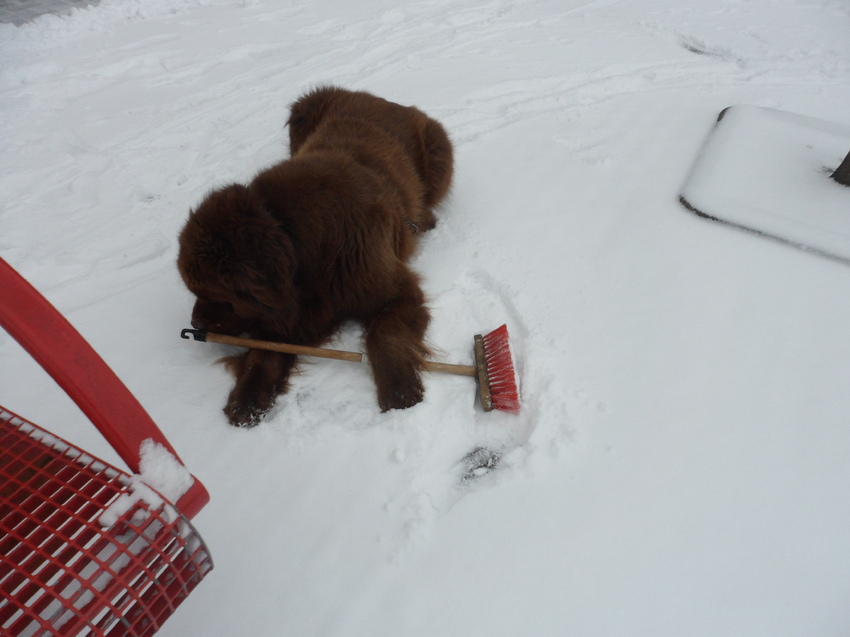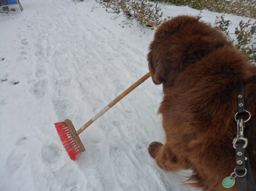 auto uit de sneeuw gehaald, o wat was dat koud, geen doen bijna, wat sneeuw weggehaald bij de deur, de rest laat ik liggen, de alg gaat er dood van... en Bamse ? die vind het heerlijk, ze mag mee helpen vegen.