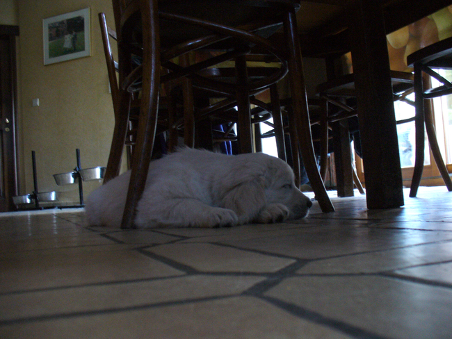 maar ze kwam er weer uit en ging onder een stoel in de woonkamer liggen en daar weer verderslapen ...