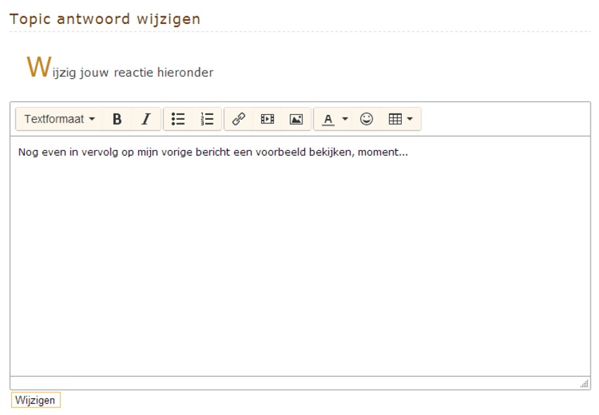 Kies ik vervolgens voor 'reageren', dan ga ik weer terug en moet ik mijn reactie opnieuw typen. Kies ik voor 'wijzigen', dan gebeurt er iets anders (zal ik zo wel even nakijken, weet het niet meer), maar besluit ik mijn bericht niet te plaatsen, dan staat ie er tóch (wat bij dit bericht ook het geval was).