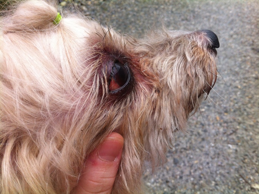 Zaterdag is onze hond op haar plek gezet door een ander. Het leek op dat hij haar pootje had, maar niet alles is gezien. Zondag viel mij op dat haar oog dik was en het oogwit bloedrood was. Gisterenochtend dacht mijn moeder dat het iets minder dik was, maar toen ik 's avonds kwam zag ik dat het bloed nu 4 cm rond haar oog op haar schedel was gegaan. Vandaag meteen de arts gebelt en om 2 uur moeten we er zijn.