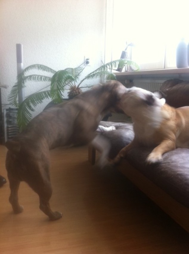 ow was nog wat vergeten, als ze weg rennen wilt ie er achter aan rennen. En tillen ze hun hond op, dan wilt ie juist tegen ze op gaan springen. Wat ik eigenlijk best een logische reactie vind.