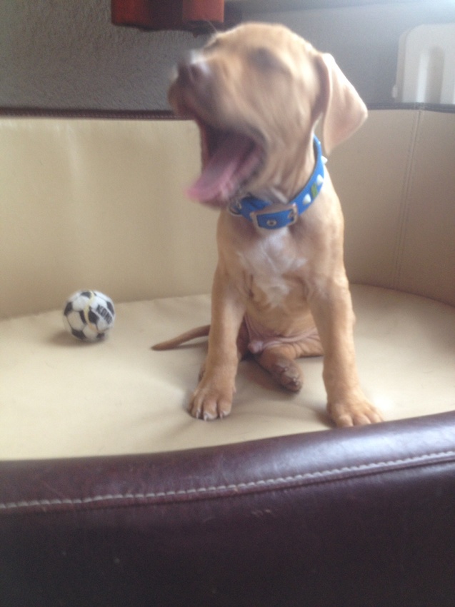 Er wonen nu 3 bulletjes vlak onder ons. 1 blaft erg veel als hij mij en Aston ziet vanaf ons balkon, 1 reageert niet maar de andere kwispelt meteen, zo leuk.